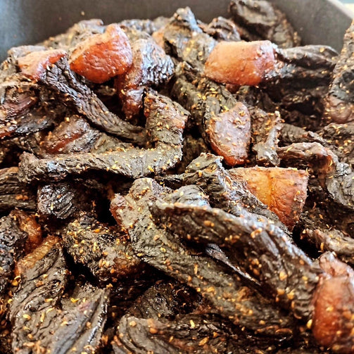 Fatty, chunky strips of air dried beef with a little bit of sweet, a little bit of spice and a whole lot of nice. This classic Asian seasoning perfectly compliments the beef- think wok fried soy sauce, garlic and ginger, perfectly rounded off with sesame seeds.